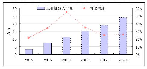 二、Industrial robots: production capacity continues to expand, and output is expected to continue to grow rapidly. At present, the number of companies involved in the production of robots in China exceeds 800, and there are a large number of traditional manufacturing companies that continue to shift to the production of industrial robots. More than 40 industrial robot parks have been completed or are under construction in China. There are also a large number of industrial parks in preparation, which are expected to be completed and put into operation in the next few years, which will further release the production capacity of industrial robots. Therefore, it is expected that in 2018, China's industrial robot output will reach 152,000 units, an increase of about 35% year-on-year; from 2017 to 2020, China's industrial robot production average annual growth rate is about 35%; by 2020, industrial robot output will be close to 239,000 units. 2017-2020 China's industrial robot output and year-on-year growth forecast:
