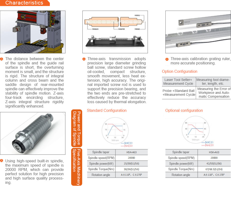 This machine tool is a five-axis sliding saddle machining center. It has the advantages of strong rigidity, symmetrical structure and strong stability. At the same time, it introduces the international advanced dynamic rigidity design concept and optimizes the design of mobile components. The machine tool has strong rigidity and good fast response characteristics, which can meet the needs of high precision aeronautical parts processing and various high precision die processing fields. |
