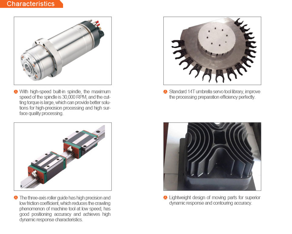 Based on the advantages of strong rigidity, structural symmetry and strong stability, the high-speed milling of graphite introduces the international advanced dynamic rigid design concept, lightweight design of moving parts, strong stability and fast response. Good characteristics. The separate design of the moving parts and the processing area separates the stone grinding dust and is suitable for the processing of graphite materials. |
